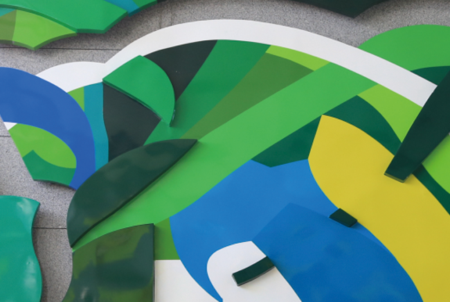 豐富的色彩從不同方位形成向內或向外輻射的動能,讓作品從平面跳出;左右兩側各有一幅作品,冷熱色系,理性與感性,表現出藝術與科學的有趣對話關係。