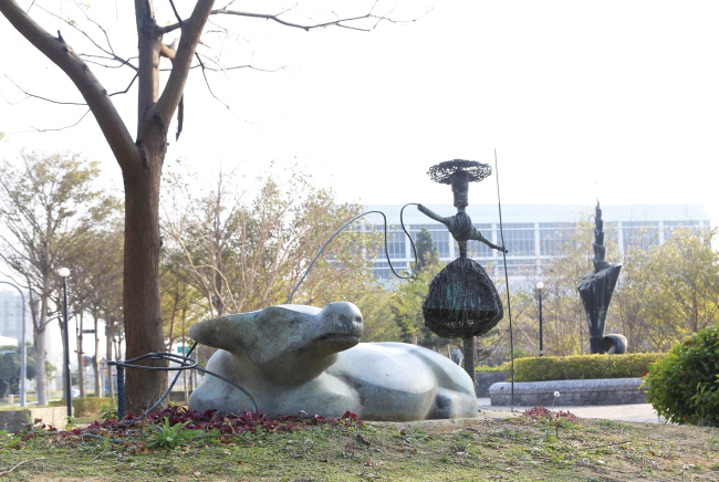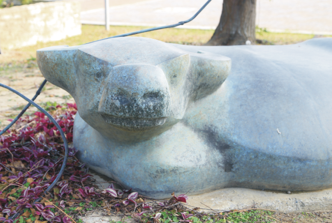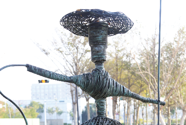 牛隻與稻草人象徵過去的社會形態,卻以充滿律動的流線舞動現代生活寫照的造型,在溫暖、親切與趣味中,演繹世代傳承及變遷的軌跡與風貌!