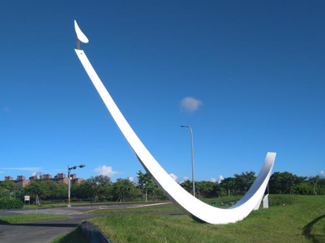 | 《創意、飛揚、串流》是一座大型的主體雕塑與七座的地景藝術,並加入風動與LED燈光相互串連的互動設計,充份表現了宜蘭科學園區的「數位創意」、「通訊串流」及「美麗生態」的特色。主體雕塑具有地標性與候鳥形體的高聳雕塑,尤其在頂部設計有可隨著風而轉動的機動藝術。在草坪上則設置有七座如街道家俱供民眾坐下休憩的地景藝術,作品的垂直面上加入豐富的幾何圖案,如五座的網格圖案表達科技感,以及兩座的宜蘭縣花(國蘭)圖案代表宜蘭在地之特色。最令人驚豔的是,其中三座的地景藝術特別設計與主體雕塑呼應的LED燈光互動創意,即在主體雕塑上安裝一個「風力感測器」,利用風力大小來改變LED燈律動的效果(風愈大燈就跳動愈快),使夜間的燈光照明更加豐富與精彩,也展現了宜蘭科學園區的科技創新精神與數位藝術之美。 |