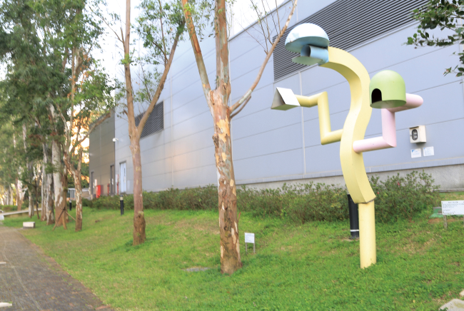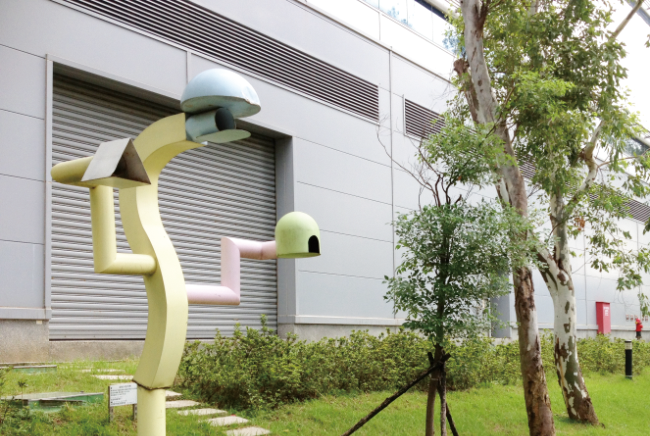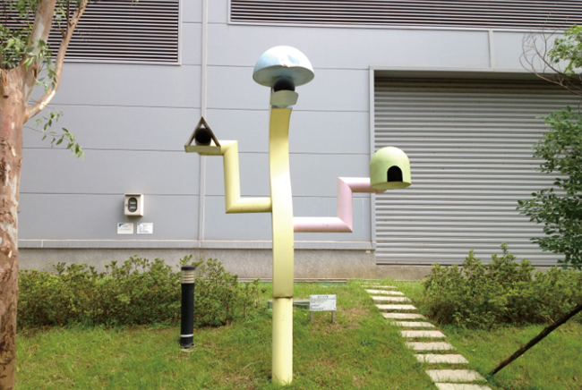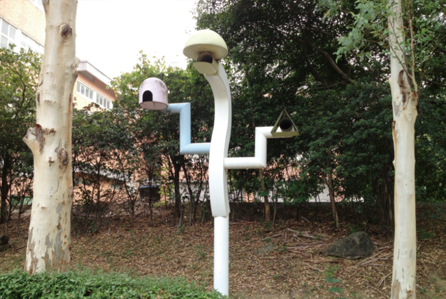 | The sculptures of bird houses are situated here and there within the woods. Besides its decorating function, the artwork aims to attract the birds as if the passers-by are in a forest. |