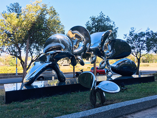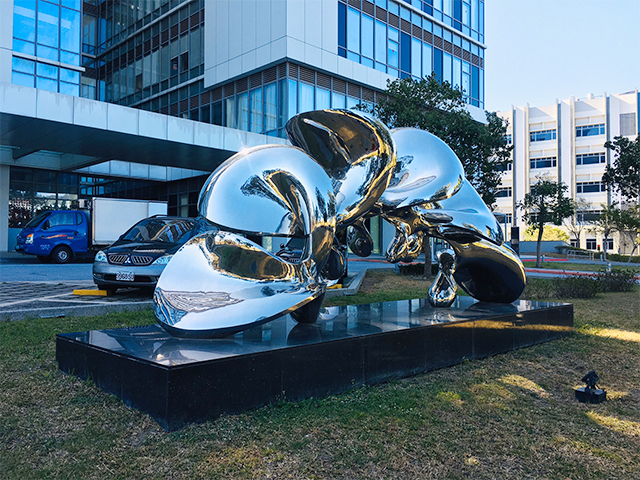 | This artwork structure takes the spiraled, swirling, repetitive and continuous characteristics of DNA, and develops them into a flower-like appearance to portray the sustaining effects and potent benefits of biotechnology towards the earth, humanity, and life. The development of biotechnology is as magnificent and beautiful as a flower in full bloom. This stainless steel sculpture placed at the entrance of the biotechnology building uses 6 mathematical symbols denoting infinity ‘∞’ to imply the infinite relationship between life and genetics, and that biotechnology is the pulse within, continuing to develop and perform as it is nourished by life. |