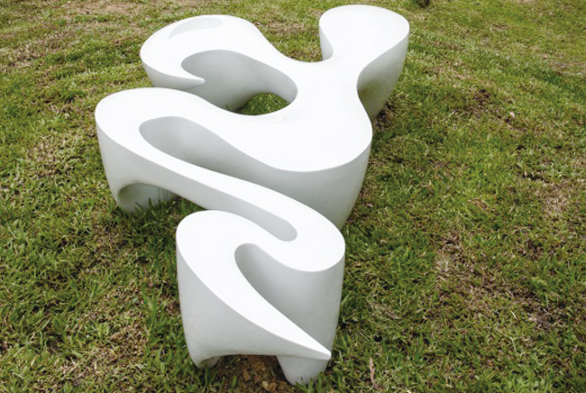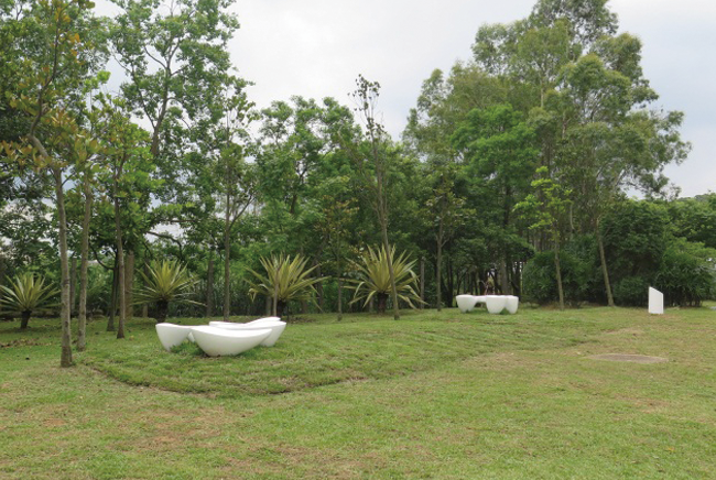 | ”Scenery in Drops” is based on the idea of dripping water forming a flowing line, it also serves as a seat and a plant holder. As the seasons change it can hold different plants and become a focus of attention, making this a highly practical work of art. In addition, the work is also mainly white, echoing the impression made by “Majesty of Spring.” This in turn establishes an association with “light” and the opto-electronics industry, the mainstay of Longtan Science Park. |