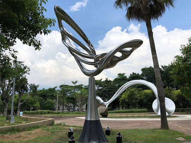 | With stacks of repeating waves and lines as metaphors for radio, light, sound, and water waves shaping a dancing and fluttering butterfly, stainless steel symbolizes modern technology."Wings of Technology" marks prosperous development and investment of high-tech industries at the Longtan Science Park, like a flying butterfly. |